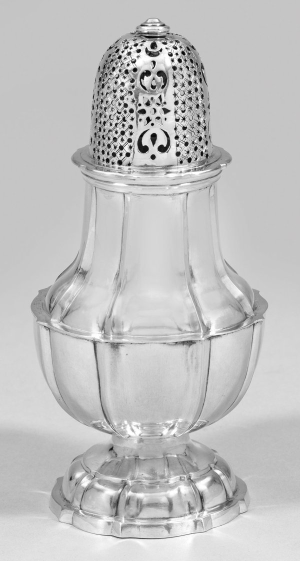 Silber. Runder, aufgewölbter Stand, mittig stark eingekehlt und übergehend in birnförmigen Korpus. Abgesetzte Schulter mit schmalem passig geschweiftem Lippenrand in sich verjüngendem Hals mit mehrfach profiliertem Lippenrand endend. Umlaufend gegliedert durch vertikal gekniffene Züge. Hoch aufgewölbter, ornamental durchbrochen gearbeiteter, aufgesteckter Streukopf mit gedrücktem Balusterknauf. Gest., unidentifiziertes "A", Meister wohl Johann Paul Rössel (erwähnt ab 1711). Gew. ca. 180 g. H. 16,5 cm.