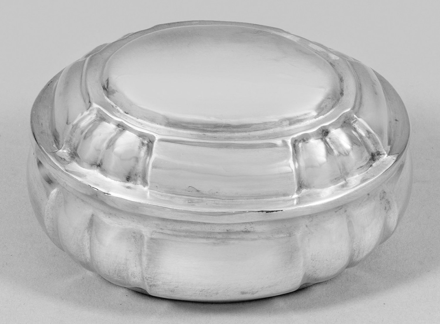 Silber. Über flachem Stand gedrückt bauchig ansteigender Korpus. Wandung und gewölbter Deckel vierfach gegliedert durch drei vertikale Züge. Unterseitig monogr. "J. M. H.". Innen vergoldet. Gest., Beschauzeichen, Meister Johann Ludwig Hummel d. J. (wird Meister ca. 1742), preußischer Steuerstempel. Gew. ca. 60 g. H. 4 cm. 7,5 cm x 6 cm.