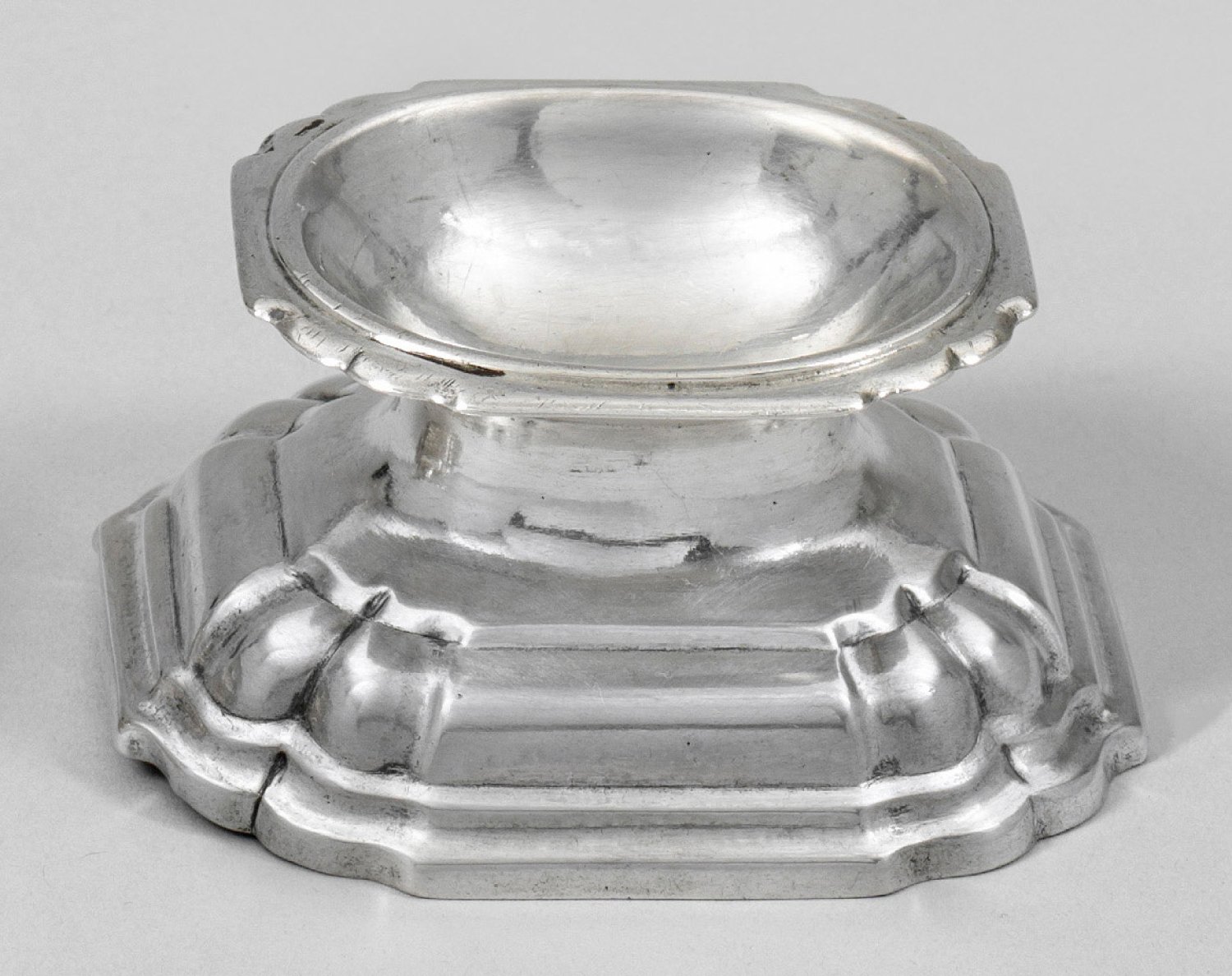 Silber. Länglich oktogonaler, mehrfach getreppter, an den Ecken durch geschweifte Züge gegliederter, aufgewölbter Stand, übergehend in ovale, gemuldete Schale mit gewelltem Rand. Gest., Tremolierstrich, Beschauzeichen, Meister Georg Leonhard Fern/Ferrn (wird Meister 1726). Gew. ca. 70 g. H. 4 cm. 8 cm x 6,7 cm.