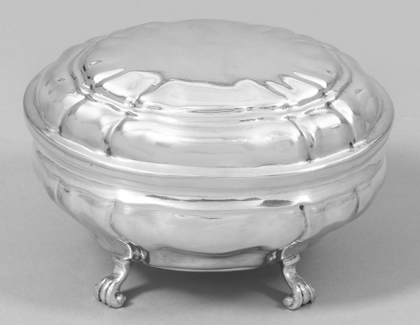 Silber. Von eingerollten Füßen getragener, gedrückt bauchig ansteigender Korpus. Wandung und gewölbter Stülpdeckel gegliedert durch passig geschweifte, wellenförmige Züge. Innen vergoldet. Gest., Tremolierstrich, Beschauzeichen, Meister Johann Georg Sack (wird Meister 1734). Gew. ca. 175 g. H. 7 cm. 11 cm x 9 cm.