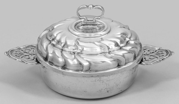 Silber. Nahezu zylindrischer, glatter Korpus mit seitlich zwei flachen, ornamental durchbrochen gearbeiteten und passig geschweiften Handhaben. Aufgewölbter, durch reliefplastische Züge gegliederter Stulpdeckel mit scharniertem Henkel als Knauf. Innen vergoldet. Gest., Tremolierstrich, Beschauzeichen, Meister Emanuel Drentwett (wird Meister 1713). Gew. ca. 405 g. H. 11 cm. Schalen-D. 13 cm