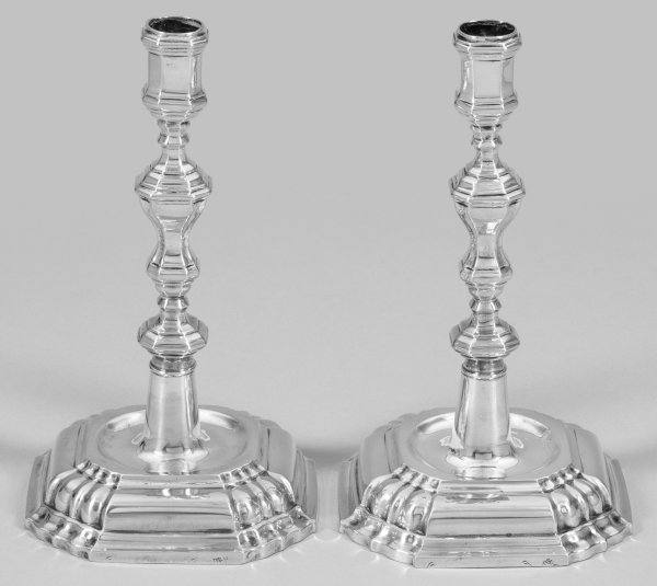 A pair of German Baroque silver candlesticks. Indistinctly marked. Test mark.