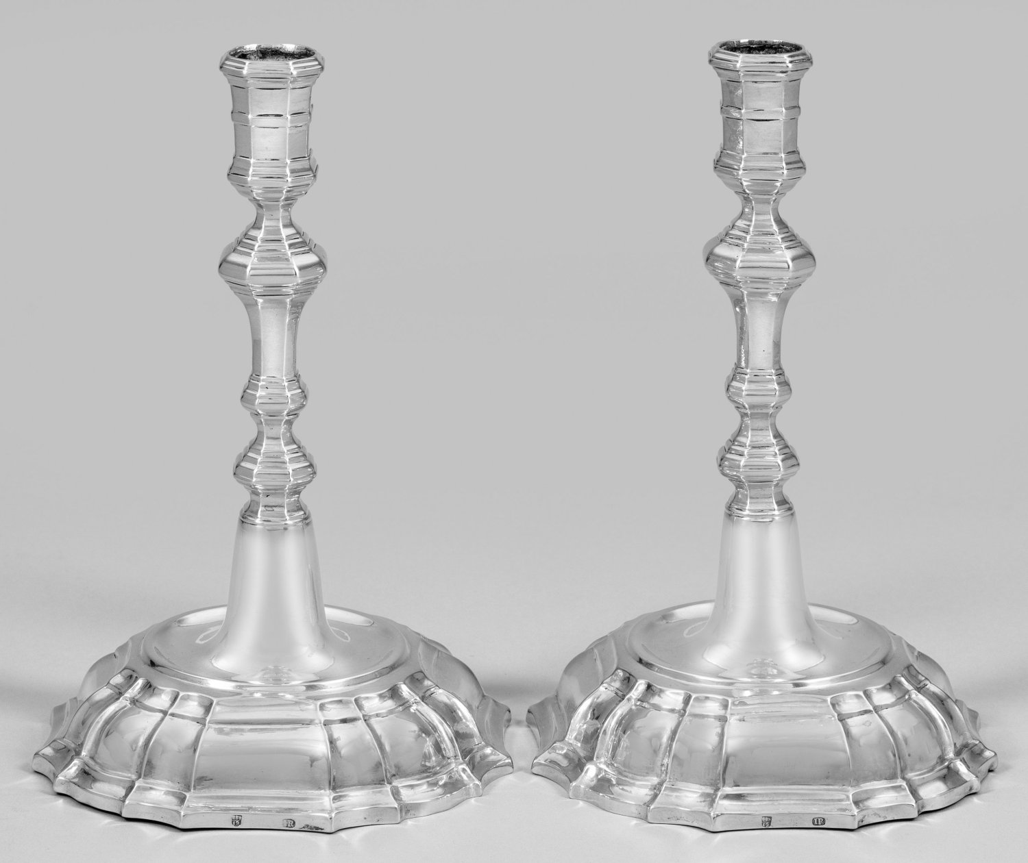 A pair of Cologne Baroque silver candlesticks by Johan Baptist Rütgers/Rötgers (active since approx. 1700). Engraved monogram. Test, standard mark 12 lot, assay and master´s mark.