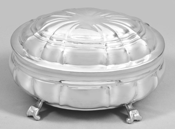 Silber. Von vier ausgestellten, eingerollten Volutenfüßen ovaler, gedrückt bauchiger Korpus. Mittig aufgewölbter Scharnierdeckel dekoriert mit konzentrisch angeordneten Zierlinien sowie gegliedert von strahlenförmig vertikalen Zügen. Wandung korrespondierend von breiten Zügen umzogen. Innen vergoldet. Gest., Tremolierstrich, Beschauzeichen, Meister Johann Georg Pfister (wird Meister 1727). Gew. ca. 170 g. H. 7,5 cm. 13 cm x 10,5 cm.