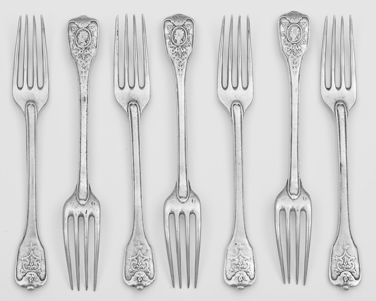 A German set of seven silver forks by Abraham III Warnberger (master since 1702). Partly indistinctly assay and master´s mark.
