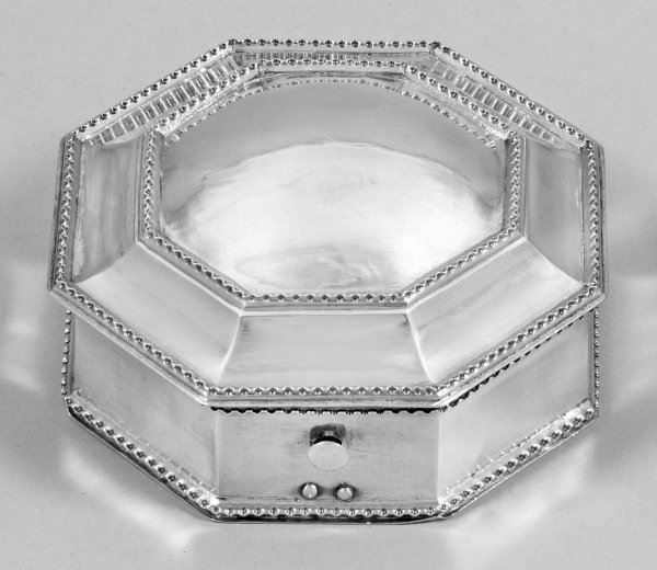 Silber. Über flachem Stand achtfach gekanteter Korpus mit glatter, facettierter Wandung und scharniertem Deckel. Deckel durch zweifaches, zartes, wellenförmiges Zierband gegliedert. Die Randzone leicht gekehlt und mittig aufgewölbt. Korrespondierend gestalteter, gering ausgestellter Stand. Schauseitiger Druckknopf als Verschluss. Gest., Tremolierstrich, Beschauzeichen, Meister Lambrecht von der Burg (wird Meister 1697), Jahresbuchstabe "S". Gew. ca. 160 g. H. 3,9 cm. 9,4 cm x 9,4 cm.