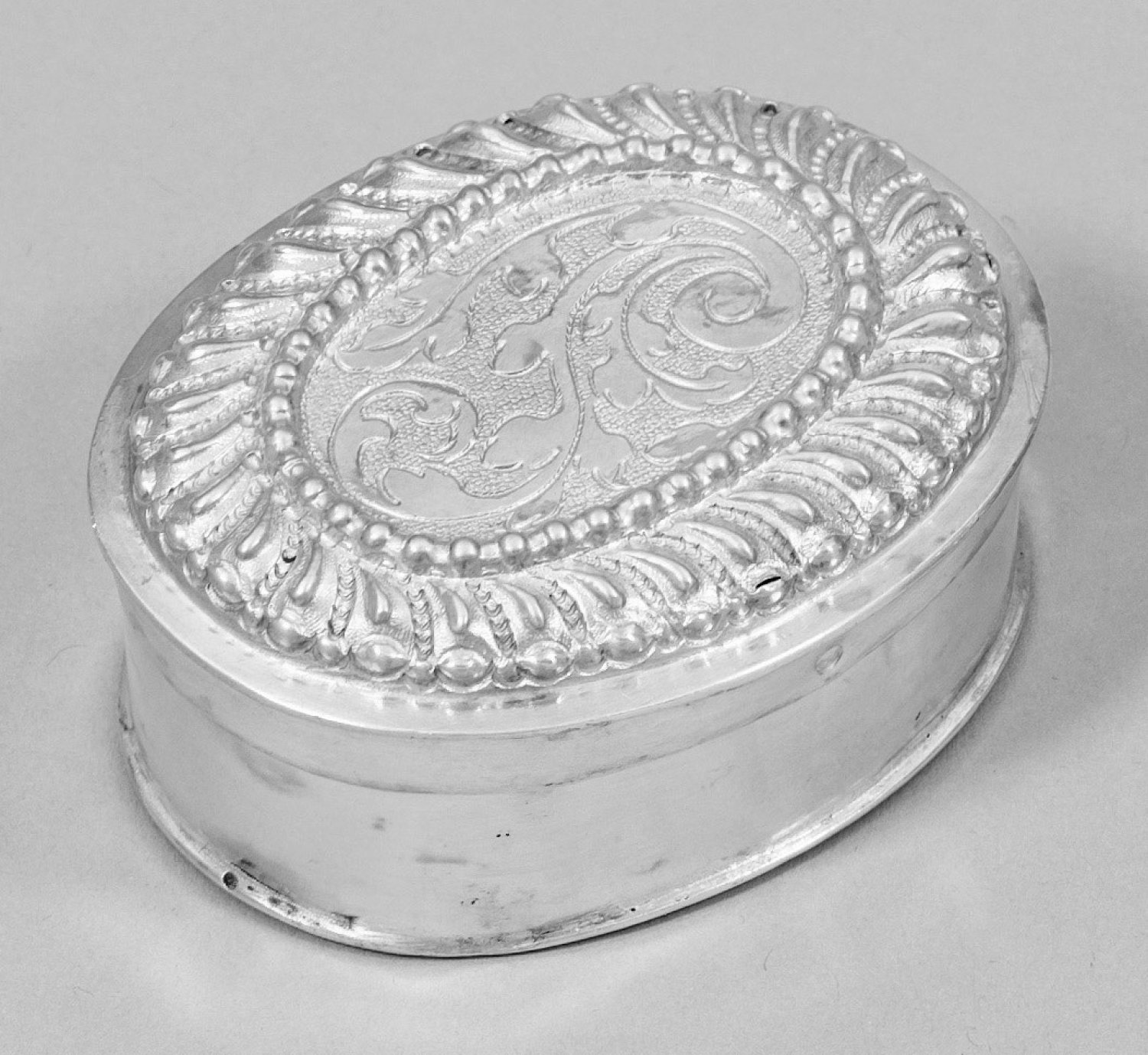 Silber. Ovale Form mit gerader, glatter Wandung. Leicht gewölbter Stülpdeckel, zentral mit Ovalmedaillon und großer Blattvolute über punziertem Grund. Der Rand mit reliefplastischem Perl- und Zungenfries umzogen. Innen vergoldet. Gest., Tremolierstrich, Beschauzeichen, Meister Johann Conrad Weiß (wird Meister 1699). Gew. ca. 45 g. H. 2,5 cm. 6,3 cm x 5 cm.