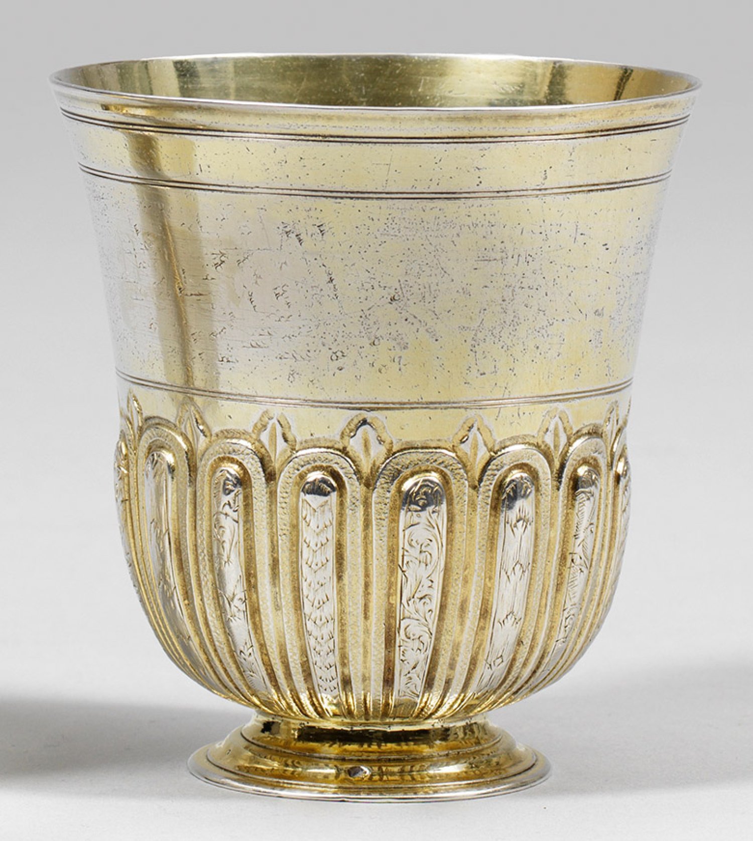 Silber, teilw. vergoldet. Auf flachem, von schmalen Profillinien umzogenem und gekehltem Rundstand hoch aufsteigende, gering ausschwingende, glockenförmige Kuppa. Durch doppelreihig angeordnete Profillinien abgesetzter Lippenrand. Untere Wandungshälfte umzogen von reliefplastisch getriebenem Zungenfries mit fein punziertem, alternierendem Blattdekor verziert und bekrönt von stilisierten, rautenförmigen Blättern. Innen vergoldet. Gest., Tremolierstrich, Beschauzeichen, Meister Matthäus II Baur (wird Meister um 1681) sowie Pächterstempel für Paris (1687-1691). Gew. ca. 95 g. H. 8 cm.