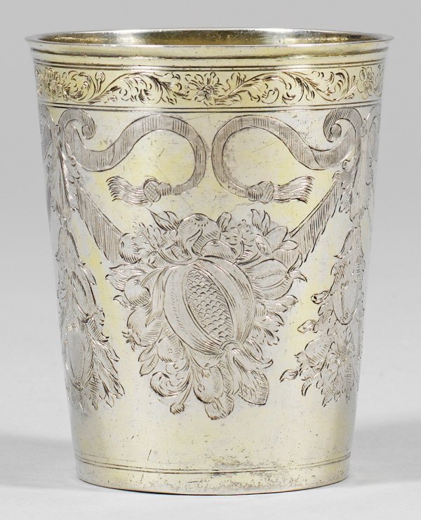 Silber, teilw. vergoldet. Sich konisch erweiternder Korpus mit mehrfach profiliertem Lippenrand. Ansatz und Randzone abgesetzt durch schmale Profillinien unterschiedlicher Breite. Wandung umzogen von fein gravierten, fließenden Bändern, Troddeln, Festons und Fruchtgehängen, u.a. mit üppig dargestellten Granatäpfeln. Unter dem Lippenrand ein zart graviertes Ornamentband mit Akanthusblattranke. Innen vergoldet. Gest., Beschauzeichen mit Ältermannbuchstabe "C", Meister Heinrich von Dort (tätig ab 1676). Gew. ca. 115 g. H. 9 cm.