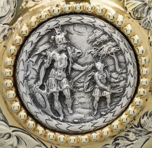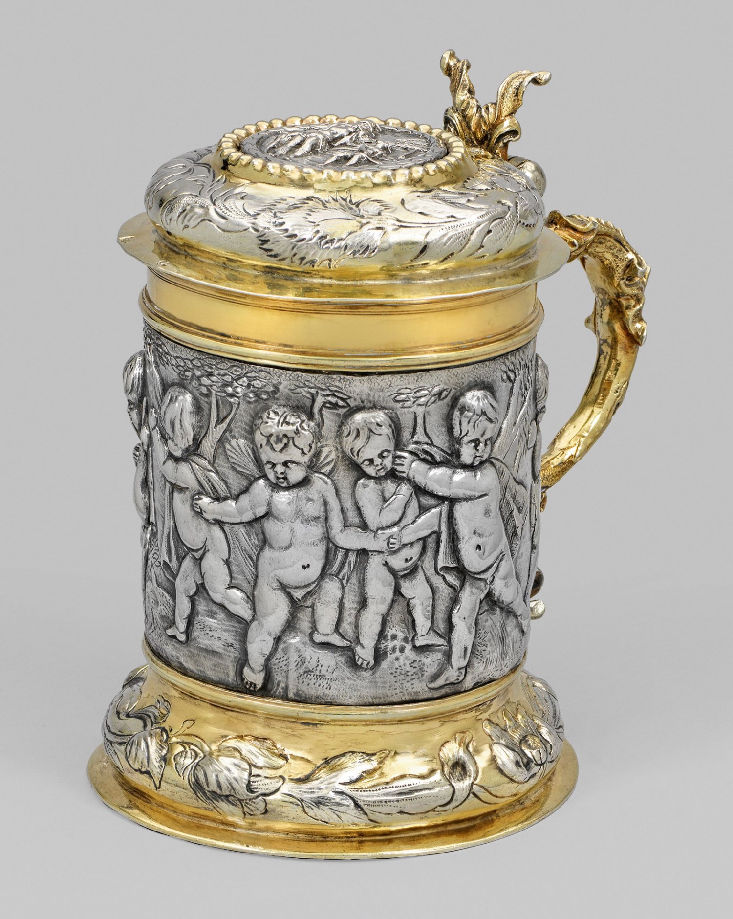 Silber, teilw. vergoldet. Gewölbter Stand, umzogen von reliefplastischem Band aus großflächig getriebenen, fein ziselierten Blüten und Blattwerk sowie abgesetzt glatter Standring. Von schmalen Profilringen gerahmter, zylindrischer Korpus mit mehrfach profiliertem, glattem Rand. Die Wandung umlaufend verziert mit stark reliefplastisch getriebenem und fein graviertem Reigen aus tanzenden und musizierenden Putti vor baumbestandener Landschaft. Wulstartig gewölbter, scharnierter Deckel mit korrespondierendem Blüten- und Blattdekor und ausgestelltem, glattem Rand. Zentral eingelassene, von einem Lorbeerkranz und Perlband gerahmte, runde Plakette mit reliefplastischer Darstellung von David und Goliath. Aufwändig reliefierter und plastisch gearbeiteter s-förmiger Henkel in zwei- bzw. dreigeteiltem Knorpelwerk endend. Auf der Unterseite des Standrings eingravierte altgriechische Inschrift. Auf dem Rand und der Standunterseite mehrfach eingeschlagene "75". Innen vergoldet. Gest., mehrere Tremolierstriche, Beschaumarke, Meister Hanß Lambrecht III (wird Meister 1630), Moskauer Repunzierung von 1778. Gew. ca. 905 g. H. 19,5 cm.