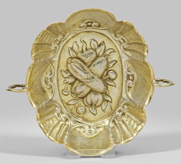Silber, teilw. vergoldet. Ovaler, achtpassig geschweifter Korpus. In glattem Spiegel reliefplastisch getriebenes und zart punziertes Fruchtbündel. Aufschwingender, wellenförmiger Rand mit reliefplastisch ausgearbeiteten C-Schwüngen und Muscheldekor. Seitlich zwei Volutenhenkel. Gest., Tremolierstrich, Beschauzeichen, Meister Hans III Petrus (wird Meister um 1621), Repunzierungsstempel für Frankreich, Paris. Gew. ca. 105 g. H. 3,7 cm. 12,7 cm x 14,3 cm.