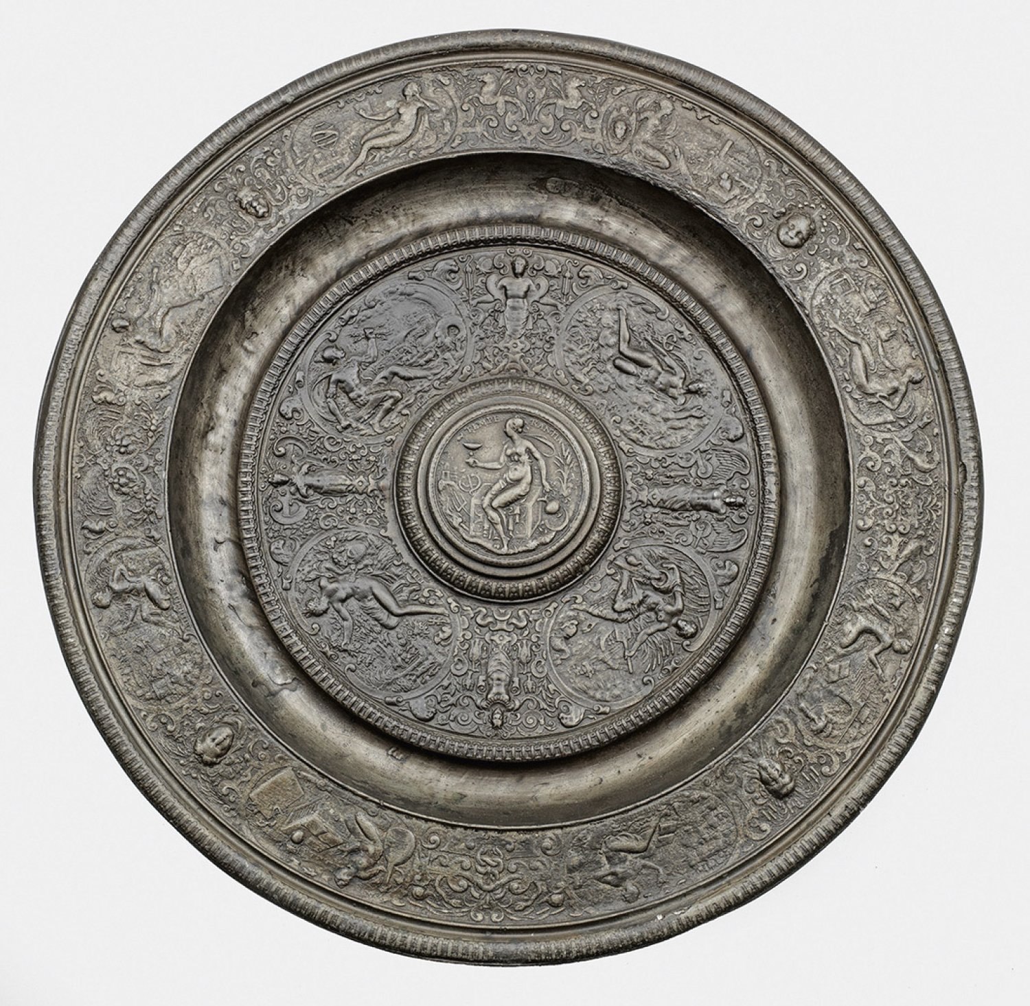 A large French 16th century relief pewter dish depicting Temperantia, by a master in the circle of François Briot. Restored.