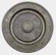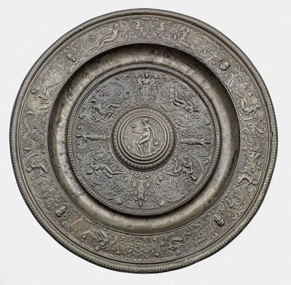 Zinn, Reliefguss. Tief gemuldete Form mit mittig erhöhtem Spiegel. Darin medaillonförmige Reserve mit szenischer Allegorie der in einer Landschaft sitzenden "Temperantia". Umlaufend breiter Fries aus von Voluten gerahmten Hermen, im Wechsel mit Allegorien der vier Elemente Erde, Feuer, Luft und Wasser in ovalen Reserven, lat. Bez. "Terra", "Ignis", "Aer" und "Aqua". Glatter, gerader Anstieg übergehend in breite Fahne mit alternierenden Darstellungen der Minerva und der sieben Freien Künsten Grammatik, Dialektik, Rhetorik, Arithmetik, Geometrie, Musik und Astronomie. Auf der Rückseite zentral eingelassene Plakette mit Profilbildnis und Umschrift "SCVLPEBAT FRANCISCVS BRIOT". Fahnenunterseite grav. "M. Sch". Rest.; D. 45 cm.