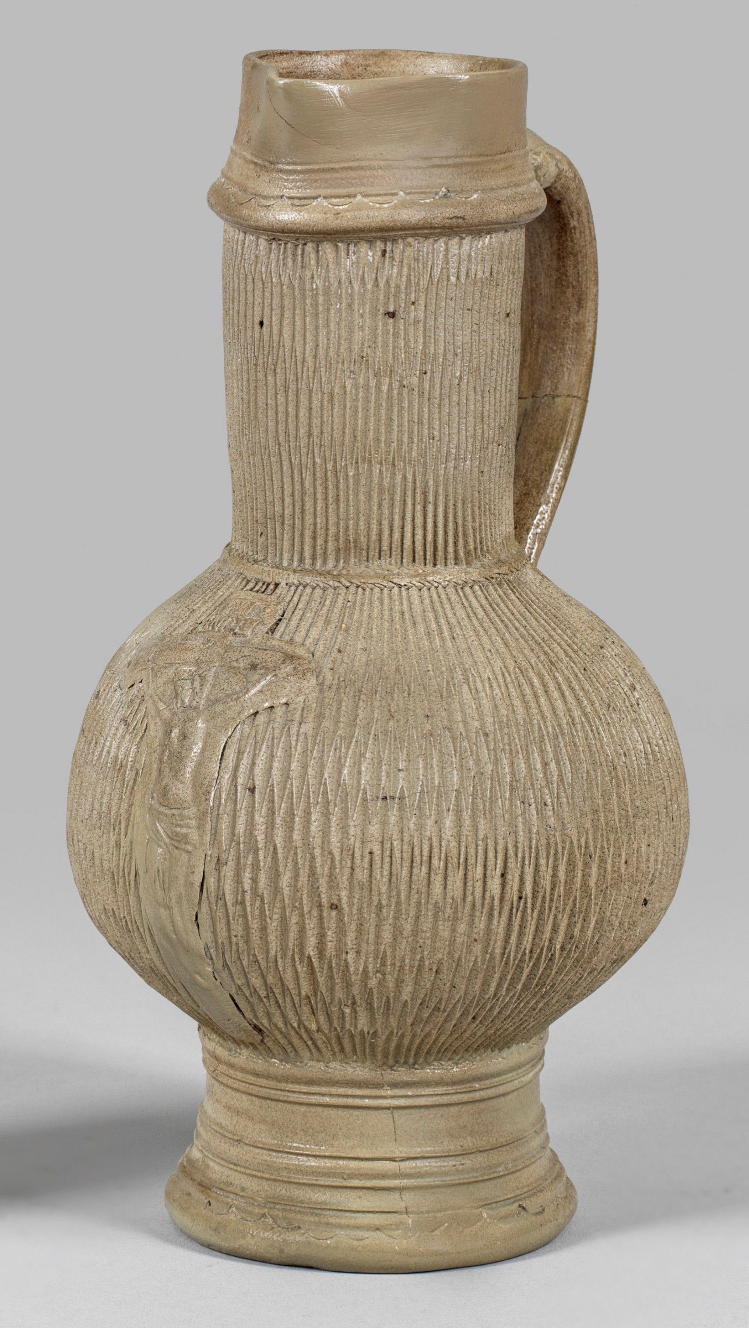 Hellgraues, salzglasiertes Steinzeug. Hoher, profilierter Fuß, kugeliger Kopus, Zylinderhals mit kurzer Schnaupe. Korpus und Hals mit flächendeckendem Kerbschnittgrund, schauseitig aufgelegte Darstellung von Christus am Kreuz. Ger. rest.; H. 23,2 cm.