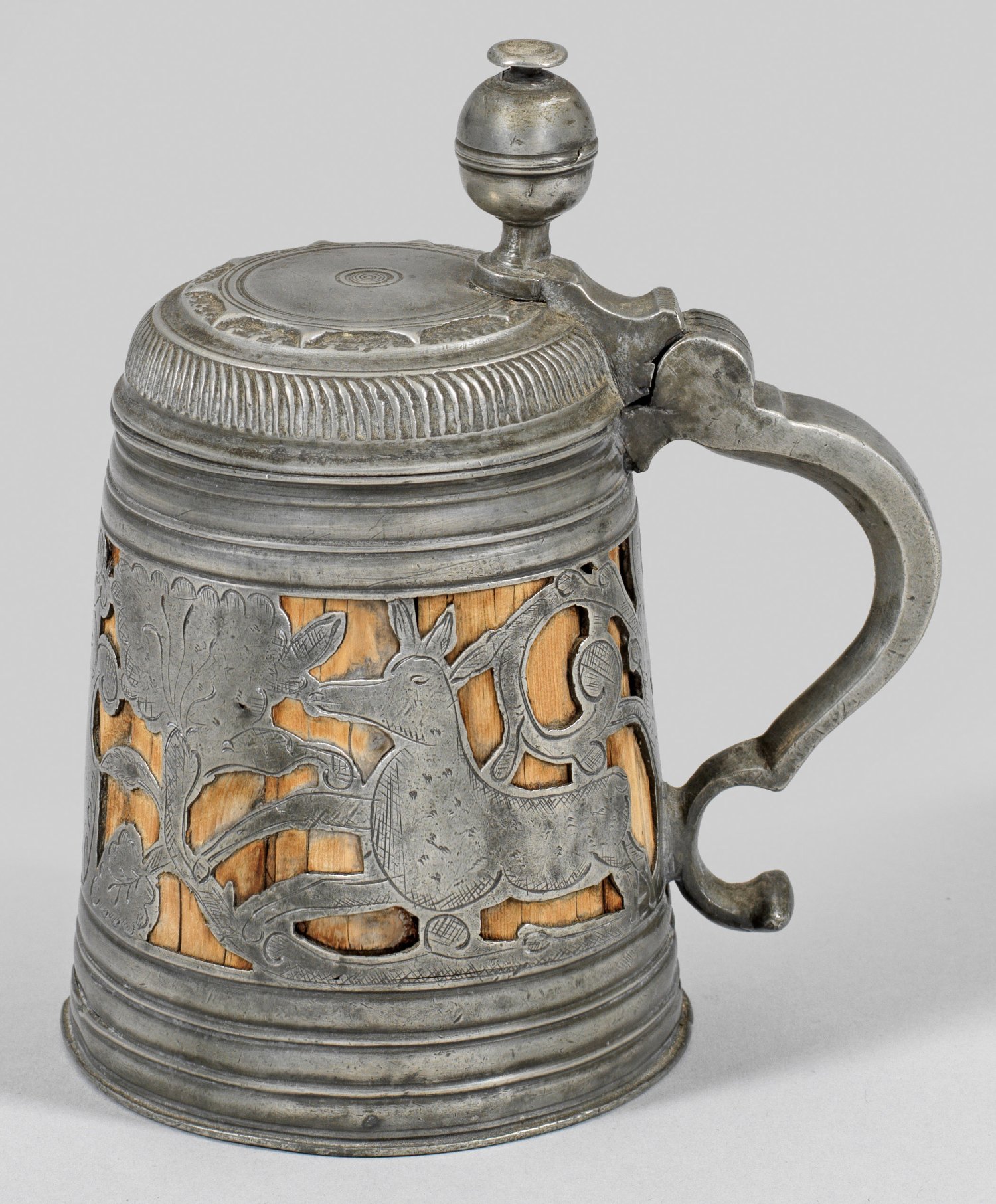Zinn und Holz. Sich konisch verjüngender Korpus mit abgesetztem, schmalem Lippenrand. Wandung zwischen profilierten, breiten Randzonen umlaufend durchbrochen gearbeitet mit Blattrankendekor, zwei springenden Hirschkühen und mittig eine bekrönte Kartusche. Aufgewölbter, profilierter Deckel mit 8-zackigem Sternmotiv und Rillendekor. Seitlich großer, geschweifter Bandhenkel mit kugeliger Daumenrast. H. 16,5 cm.
