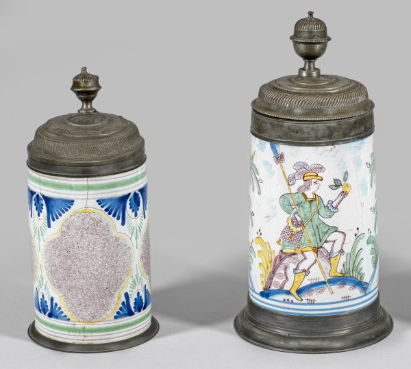 Fayence, jeweils mit Zinnmontierung und -deckel. Polychrome Scharffeuerdekore. Ein großer Walzenkrug mit Darstellung eines rastenden, höfisch gekleideten Schäfers in stilisierter Landschaft, auf dem Deckel ein eingelassenes Medaillon der 1730-1740 regierenden Zarin (Kaiserin) Anna von Russland und ein graviertes Monogramm mit Dat. 1763; ein Walzenkrug mit ornamentalem Dekor und manganviolett jaspierten Kartuschen. Haarrisse. H. 23,5 cm-29 cm.