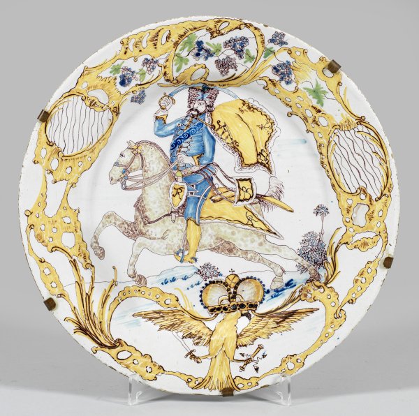 A rare large German polychrome faience plate depicting the Prussian cavalry hussar general Hans Joachim von Zieten on horseback and a Prussian eagle. Minor chips to the rim. Manufacturer's or painter's mark "T: F:".