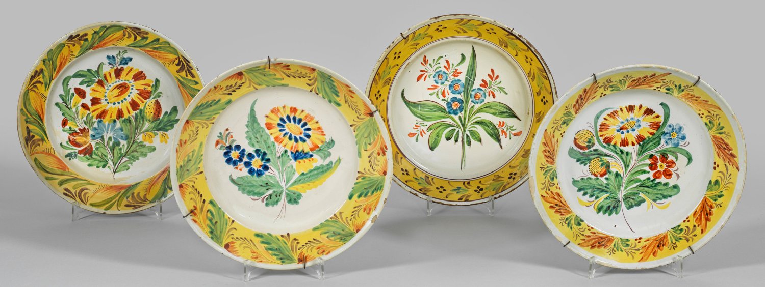 Fayence, polychromer Scharffeuerdekor aus einem Blumenbukett, gelbe Fahne mit Rankenbordüre. Rand bzw. Standring ger. best., ein Teller rest.; D. 31 cm-31,5 cm.