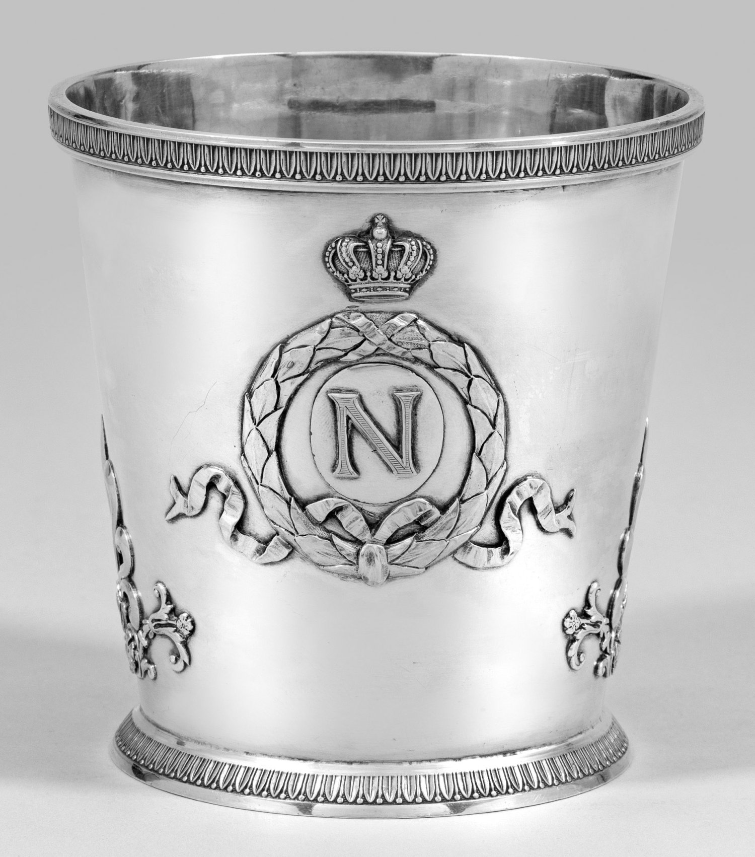 Silber. Über schmalem, ansteigendem Standring, konischer, dickwandiger Korpus mit abgesetztem Rand. Standring und Rand umzogen von reliefiertem, zartem Lorbeerblatt- und Stabfries. Auf der glatten Wandung schau- und rückseitig je ein erhabenes Ovalmedaillon mit appliziertem Napoleon-Monogramm "N", umgeben von bekröntem, reliefplastischem Lorbeerkranz mit Schleife. In den Zwischenräumen stilisierte Palmetten, flankiert von Blütenkelchen. Gest., französischer Ausfuhrstempel seit 1879, Herstellerzeichen. Gew. ca. 540 g. H. 13 cm.
