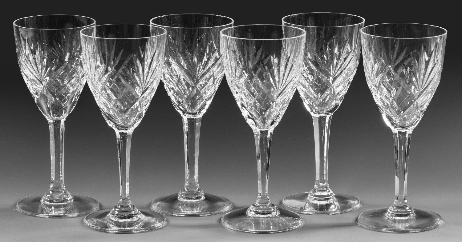 Farbloses Kristallglas, geschliffen. Leicht ansteigender Scheibenfuß, sechsfach geschälter Schaft, die ovoide Kuppa mit ornamentalem Schliff. Auf fünf Gläsern Firmen-Ätzstempel. H. 17,8 cm.