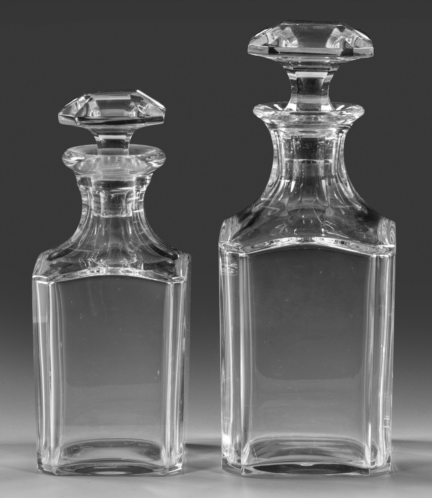 Two Baccarat cut crystal glass whisky decanters with stoppers. Each with acid factory mark.