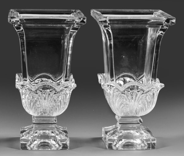 A pair of French crystal glass krater vases in the style of Baccarat.