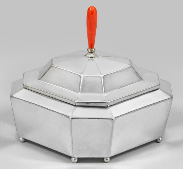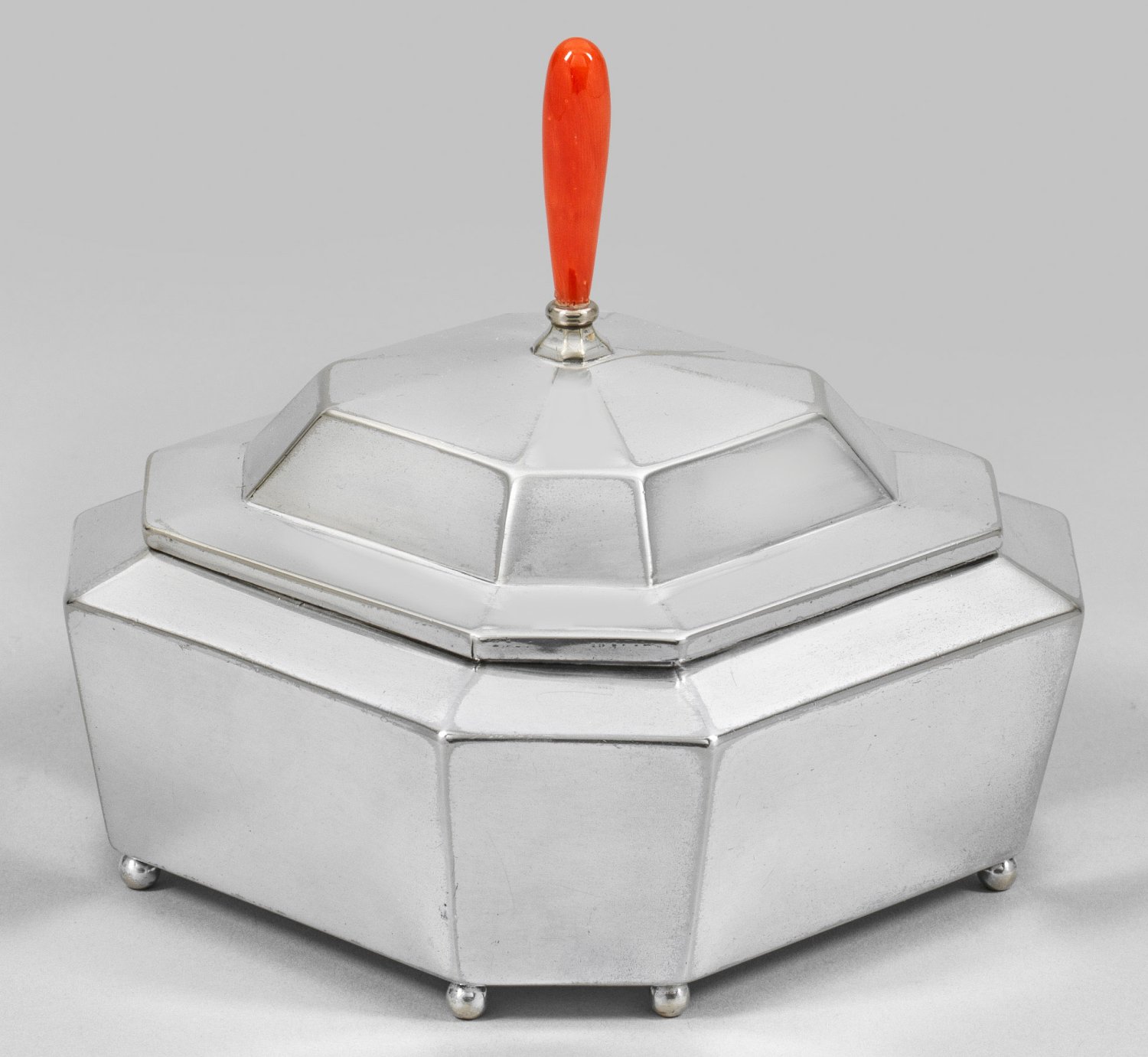 Messing, versilbert. Quadratische Form mit abgeschrägten Ecken. Konisch sich erweiternder, glatter Korpus mit abgesetzter Schulter über acht kleinen Kugelfüßen. Getreppt aufsteigender, facettierter Deckel mit markantem, länglich tropfenförmigem Knauf aus lachsfarbener Koralle. Wohl nach einem Entwurf von Josef Hoffmann (1870-1956) oder Eduard Josef Wimmer-Wisgrill (1882-1961). H. 11 cm. 11,5 cm x 11,5 cm.
