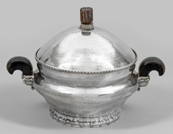 Silber. Wulstartig gekniffener Rundstand, übergehend in gedrückt bauchigen Korpus mit gering eingezogener Schulter und wellenförmig verziertem, schmalem Rand. Hoch aufgewölbter, haubenartiger Deckel mit würfelförmigem, dunkelbraun gebändertem Holzknauf. Wandung flächendeckend von feinem Hammerschlag überzogen. Seitlich zwei gebogte, sich konisch erweiternde Handhaben aus ebonisiertem Holz, am Ansatz von Volute gefasst. Gest. 800, Herstellerzeichen, Händlermarke "Sönnichsen". Gew. ca. 705 g. H. 19,5 cm. Schalen-D. 17,5 cm.