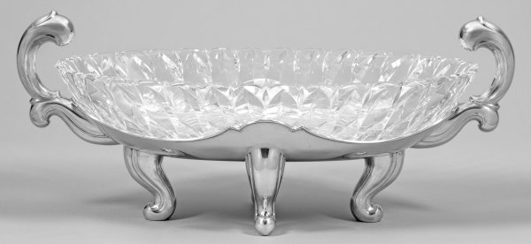 Sterlingsilber und farbloses Kristallglas. Über vier hohen, geschweiften Füßen schiffchenförmiger, glatter Korpus mit niedriger Wandung und passig geschweiftem, profiliertem Rand. Seitlich zwei aufsteigende, volutierte Henkel. Korrespondierend geformter Glaseinsatz mit sternförmigem, reichem Schliffdekor. Gest. 925, Herstellerzeichen. Gew. ohne Einsatz 1130 g. H. 27 cm. 56 cm x 25,5 cm.