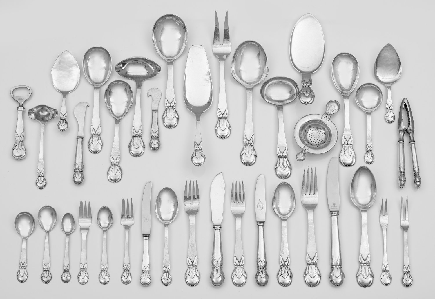 Silber. 165-tlg.; 12 Menümesser, 14 -gabeln, 3 -löffel, 11 Speisemesser, 12 -gabeln, 3 -löffel, 12 Fischmesser, 12 -gabeln, 20 Kuchengabeln, 7 Dessertmesser, 11 -löffel, 14 Kaffeelöffel, 6 Teelöffel, 28 Vorlegeteile u. a. Nussknacker, Kuchen- und Pastetenheber, Saucenschöpfer, Flaschenöffner, Fleischvorleger, Vorlegelöffel - und gabeln, Teesieb. Laffe und Heftoberseite mit feinem Hammerschlagdekor, in Form eines stilisierten Granatapfels mit Blattansatz. Klingen aus Edelstahl. Gest. u. a. 835, Stadtmarke sowie verschiedene Jahreszahlen, Beschaumeister C. F. Heise, teilw. unterschiedliche Herstellerzeichen. Gew. zus. ca. 7290 g (Gew. ohne gefüllte Teile ca. 4580 g).