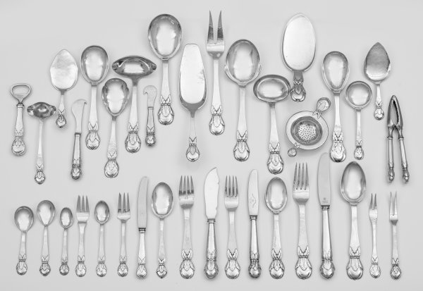 A Danish Art Nouveau 165-piece silver rest cutlery. Partly with owners monogramm or dedications. Stainless steel blades. Assay, assay master´s mark. Different maker´s mark and different dates.