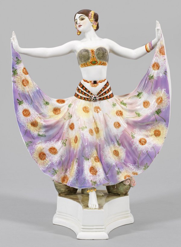 Steingut. Auf einer dreipassigen Plinthe Darstellung der schreitenden Tänzerin Ruth Saint Denis in einem bauchfreien, orientalischen Kostüm bei der Aufführung ihres Tanzes "Radha" ("Tanz der fünf Sinne", Uraufführung 1906). Hinter ihr auf der Plinthe zwei Rosenkörbe. Polychrome Unterglasurbemalung. Modell-Nr. 3992, Entw. um 1911/12. Ger. rest., mimim. Glasurchips. Entw.-Bez. "Rosé", Manufakturmarke mit Bez. "Made in Austria"; kleine Pressmarke mit undeutl. Ligatur-Monogramm. H. 53,5 cm.