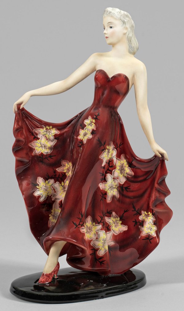 Steingut. Auf einer ovalen, schwarz staffierten Plinthe schreitende junge Dame in dunkelrotem Abendkleid mit großem Blumenmuster. Modell-Nr. 8483. Entw. Klára Herczeg (Claire Weiss-Herczeg), um 1939. Firmenmarke mit Bez. "MADE IN GERMANY". H. 35,8 cm.