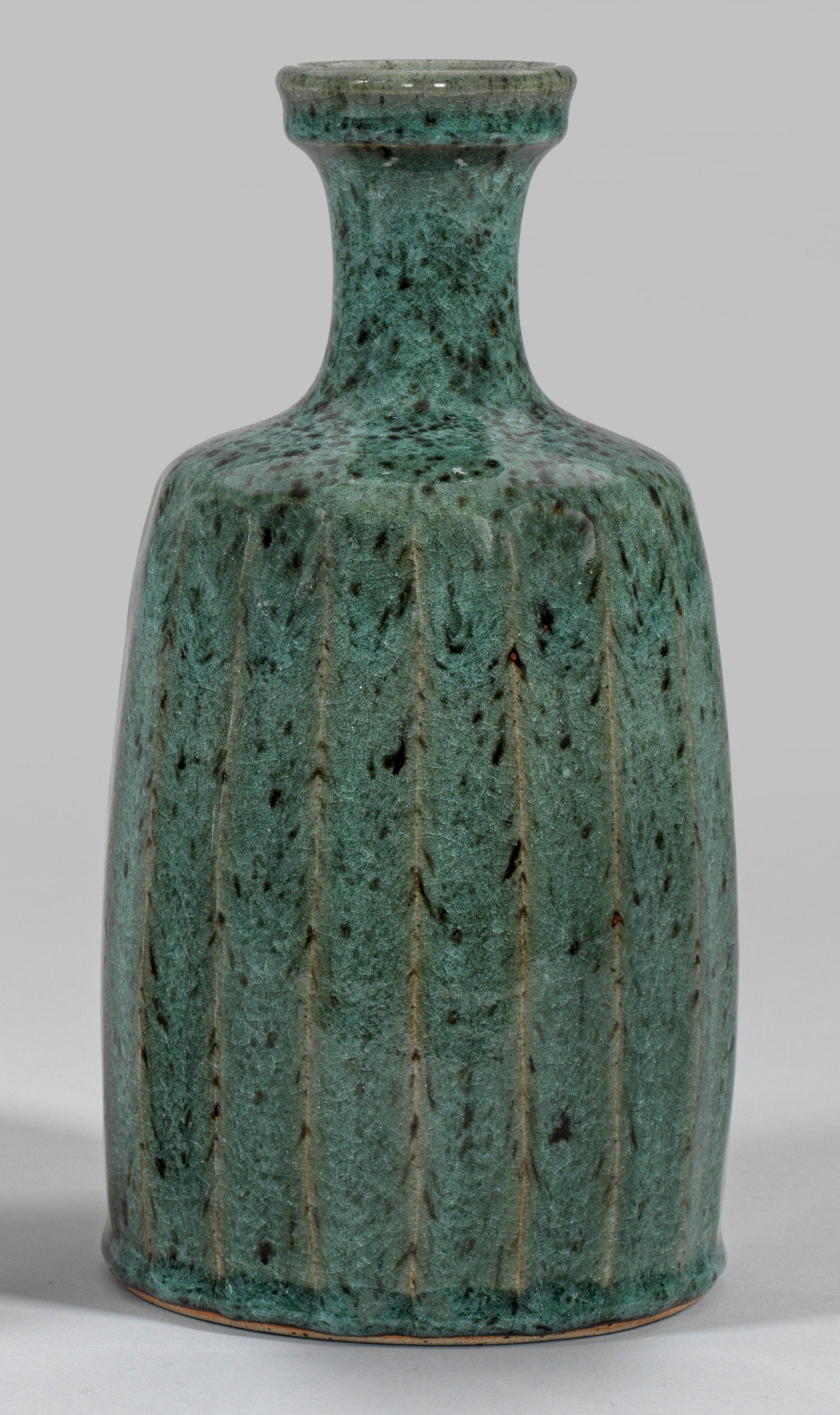 Unikat. Steinzeug, hellgrauer Scherben mit Pyriteinschlüssen. Polygonal geschnittener, walzenförmiger Korpus, abgesetzter Lippenrand. Grüne, craquelierte, seladonartige, dunkel gesprenkelte Glasur. Geritzte Sign. mit Dat. "Kerstan (/) 169.2000". H. 27,5 cm.