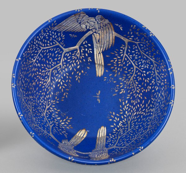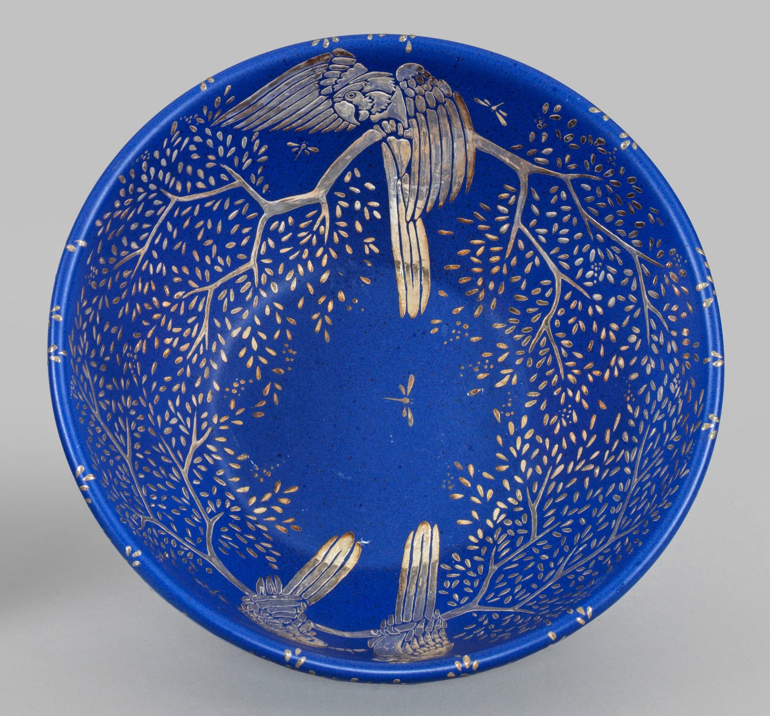 A Mexican dark blue glazed porcelain or ceramic bowl with fine silver decor of parrots. Marked.
