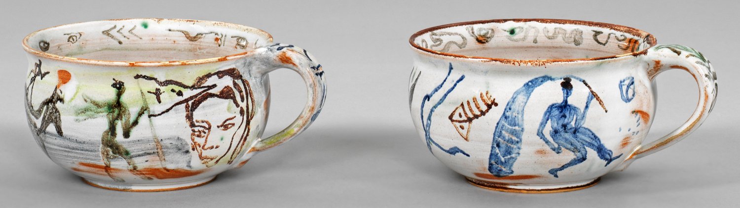 Two unique faience tea cups painted by the artist Cornelia Schleime. Some minor rubbing and slight glaze chips to the rims.