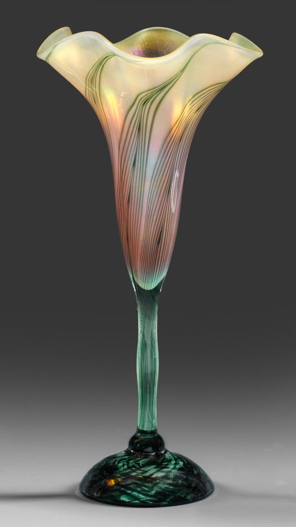 Auf massivem, weit ausgestelltem, gewölbtem Fuß gedrückter Kugelnodus und mittig leicht verdickter Stängel als Schaft, die hohe, glockenförmige Kuppa oberhalb als fünfpassige Blüte ausgezogen. Farbloses Glas, der Fuß mit dunkelgrünen Spiralfäden, die Kuppa mit Weißopal überfangen sowie mit grünen und silbergelben Fäden umsponnen und zu fünf gefiederten Lanzettblättern ausgezogen; das Kuppainnere goldfarben sowie grünlich und hellviolettfarben irisiert. Sign. "L. C. Tiffany Favrile A 3895". H. 24,5 cm.