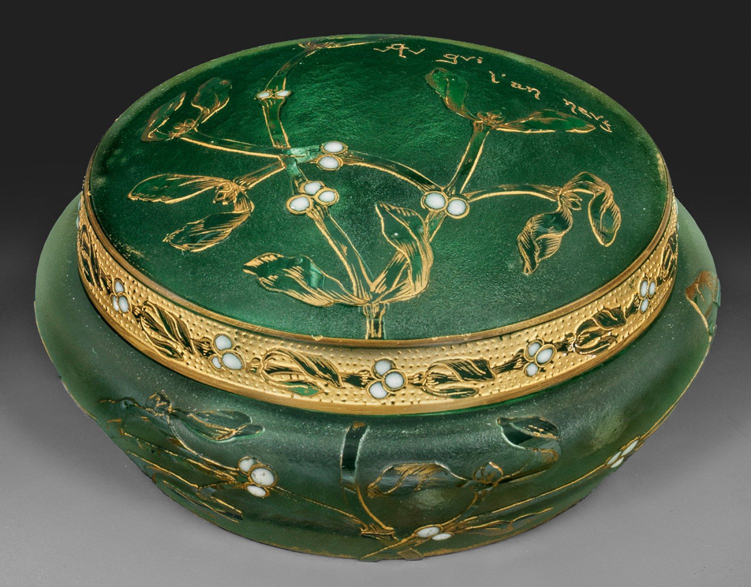Flache, runde Form mit konischem Unterteil, leicht gewölbter Stülpdeckel. Überfangglas, farblos und hellgrün. In mehreren Arbeitsgängen geätzter, goldgehöhter Dekor aus Mistelzweigen und Spruch, die Beeren mit weißer Emailmalerei, eisglasartiger Grund. Am Deckelrand ein korrespondierender Mistelfries. Entw. Henri Bergé, um 1897. Sign. "Daum Nancy" mit Lothringer Kreuz in Gold. H. ca. 5,2 cm; D. 10,3 cm.