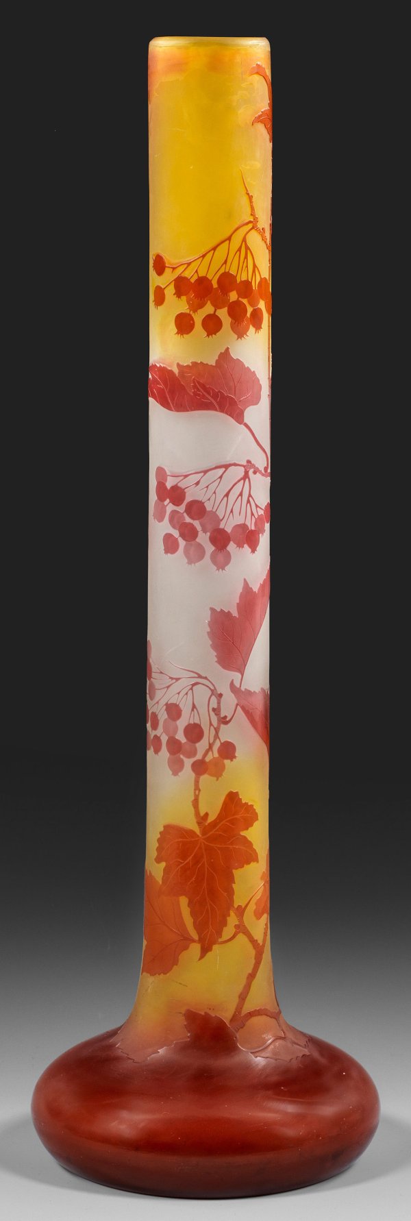 Stangenform mit ausgestelltem Fuß. Überfangglas, farblos, bernsteingelb und violett bzw. rot. In mehreren Arbeitsgängen ausgeführter, geätzter und teilw. polierter Dekor aus reifen Johannisbeerzweigen. Sign. Gallé. H. 59,2 cm.