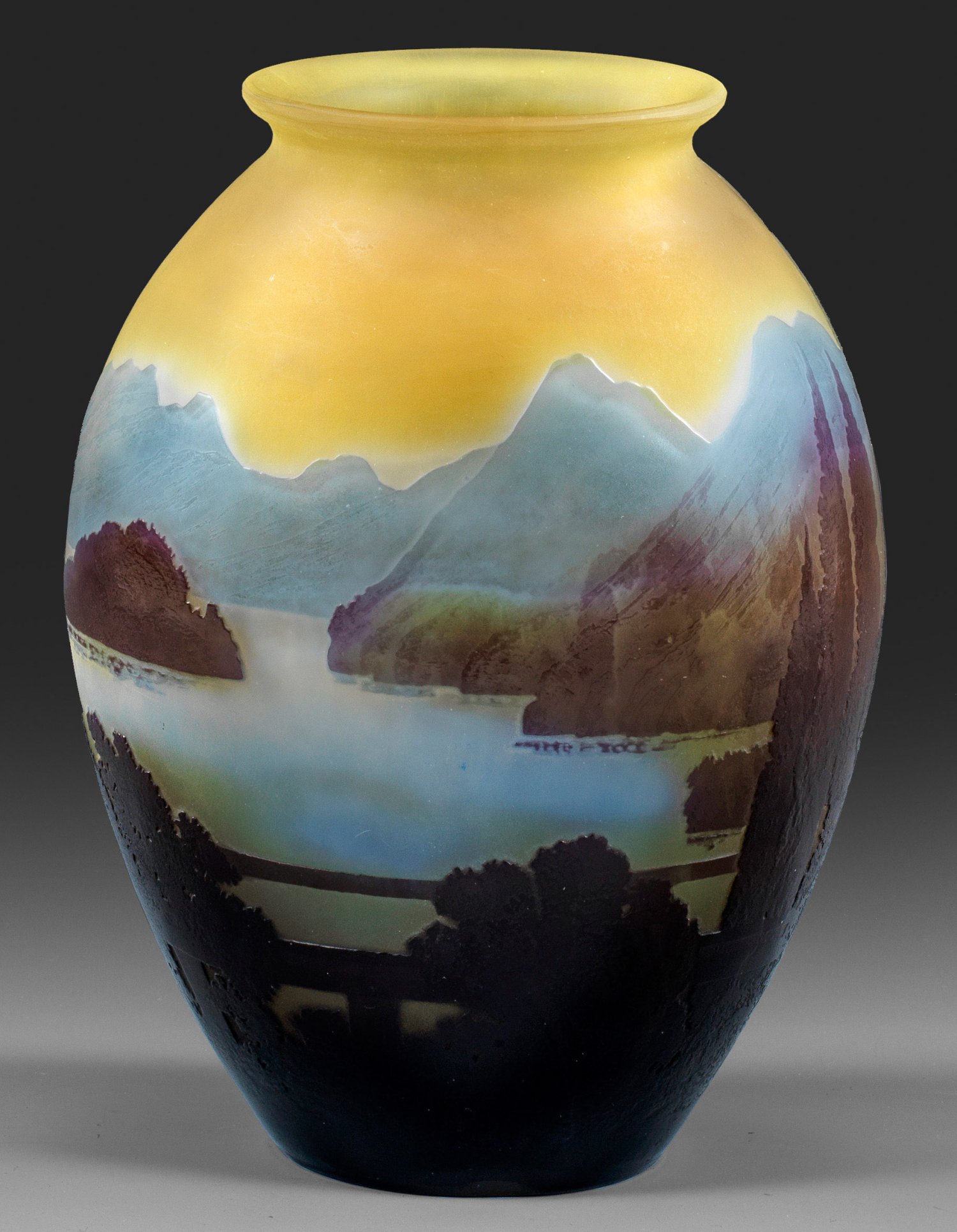 Ovoider Korpus mit auskragendem Lippenrand. Überfangglas, farblos, bernsteingelb, hellblau, violett und braun. In mehreren Arbeitsgängen geätzter und polierter Dekor mit abendlich gestimmtem Landschaftsmotiv am Comer See - Blick vom baumbestandenen Ufer mit Zypressen auf den See, im Vordergrund eine Balustrade, im Hintergrund die pittoreske Alpenkulisse. Sign. Gallé. H. 20,5 cm.