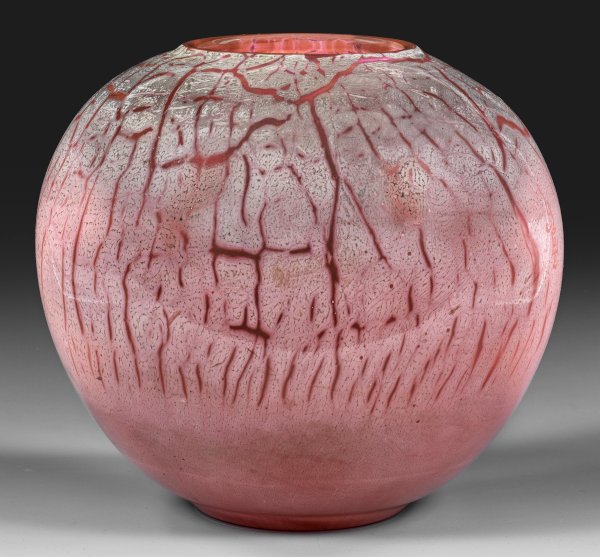 Dickwandiges Überfangglas, farblos bzw. cremefarben sowie lachsfarben, darüber opak weiße Deckschicht, durch Abschrecken im Wasser gekrackt und mittels erneuten Aufblasens des Gefäßes vielfältig aufgerissener Schlangenhauteffekt-Dekor. Sign. Gallé (tiefgeätzter Schriftzug). H. 29 cm.