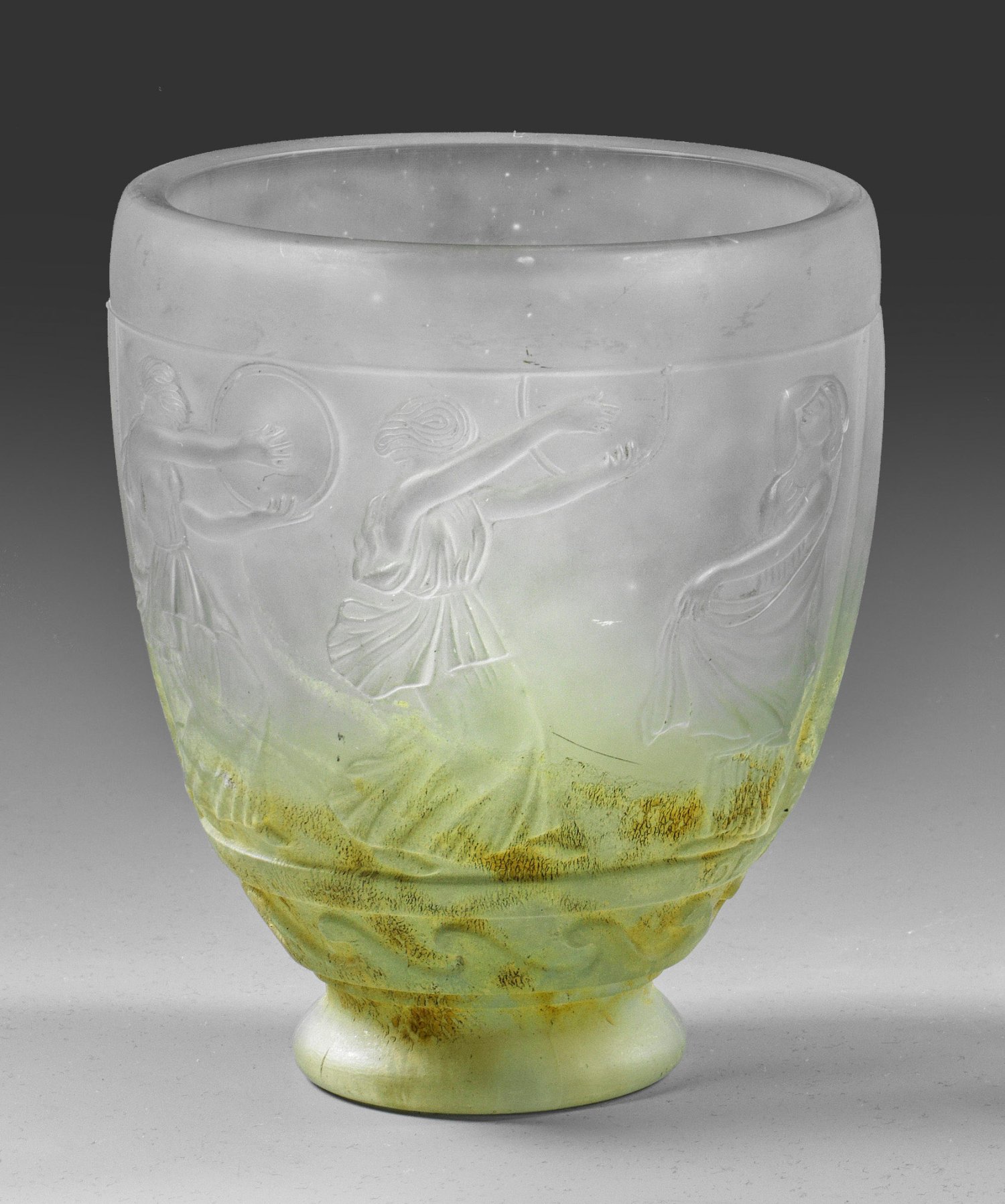 Ovoide Becherform mit weiter Öffnung auf leicht augestelltem, profiliertem, kleinem Fuß. Farbloses Glas, partiell mit gelben Pulvereinschmelzungen, formgepresst und satiniert. Umlaufend flach reliefierter antikisierender Figurenfries. Entw. Georges de Feure, um 1910-1914. Zweifach bez. "DE FEURE" und "De Feure" (erhaben formgepresst). H. 14 cm.