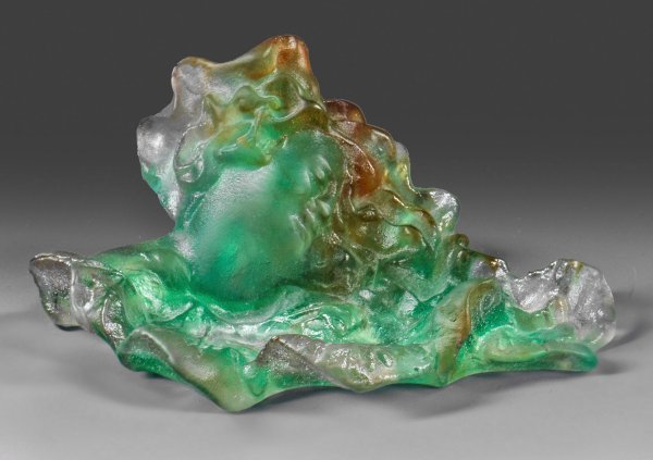 Reliefplastische Schale mit Bacchus-Kopf im Profil, umgeben von Weinblättern. Pâte de verre (bzw. Pâte de cristal), farblos, hellgrün und bernsteinfarben. Sign. Daum France. H. 5 cm; B. 13,2 cm.