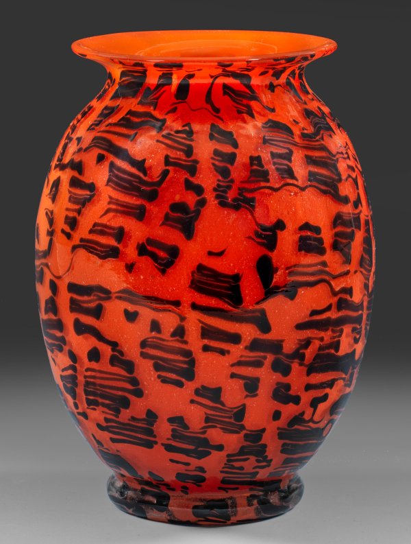 Leicht gebauchte Form mit auskragendem Rand. Überfangglas, kräftige, farblose Zwischenschicht, leuchtend rot unterfangen, der Überfang mit unregelmäßigem Fleckendekor aus schwarzen Fäden. Ausgeschliffener Abriss. H. 19,8 cm.