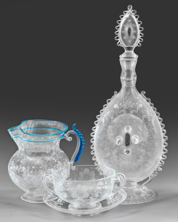 3-tlg.; Bestehend aus Karaffe mit Stöpsel, Zierkrug und doppelhenkeliger Schale bzw. Tasse mit Unterschale. Dünnwandiges, farbloses Glas, gekniffene, teilw. türkisblaue Fadenauflagen, Blütenrankendekor. H. 5,8-32,5 cm; Unterschale D. 13,7 cm.