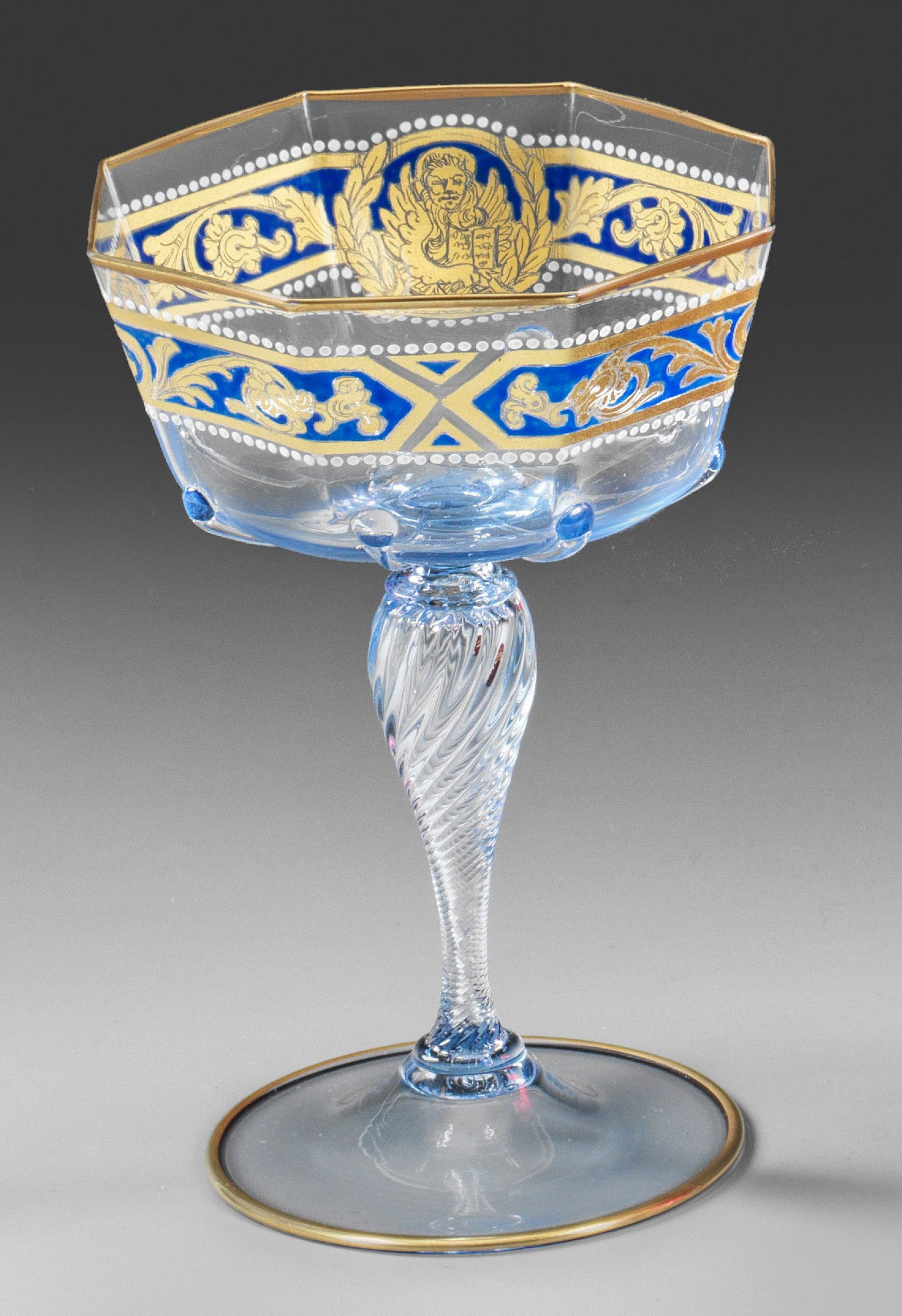 Hellblaues, transparentes Glas. Ansteigender Scheibenfuß mit umgeschlagenem Rand, schrägoptischer bzw. gerippter, hohler Keulenschaft, die weite, achteckige Kuppa mit acht korrespondierenden, einen Stern bildenden Fadenauflagen. Auf der Kuppa eine Bordüre mit Akanthusranken und dem Markuslöwen in blauer und weeißer Emailmalerei und radiertem Gold. H. 14,8 cm.