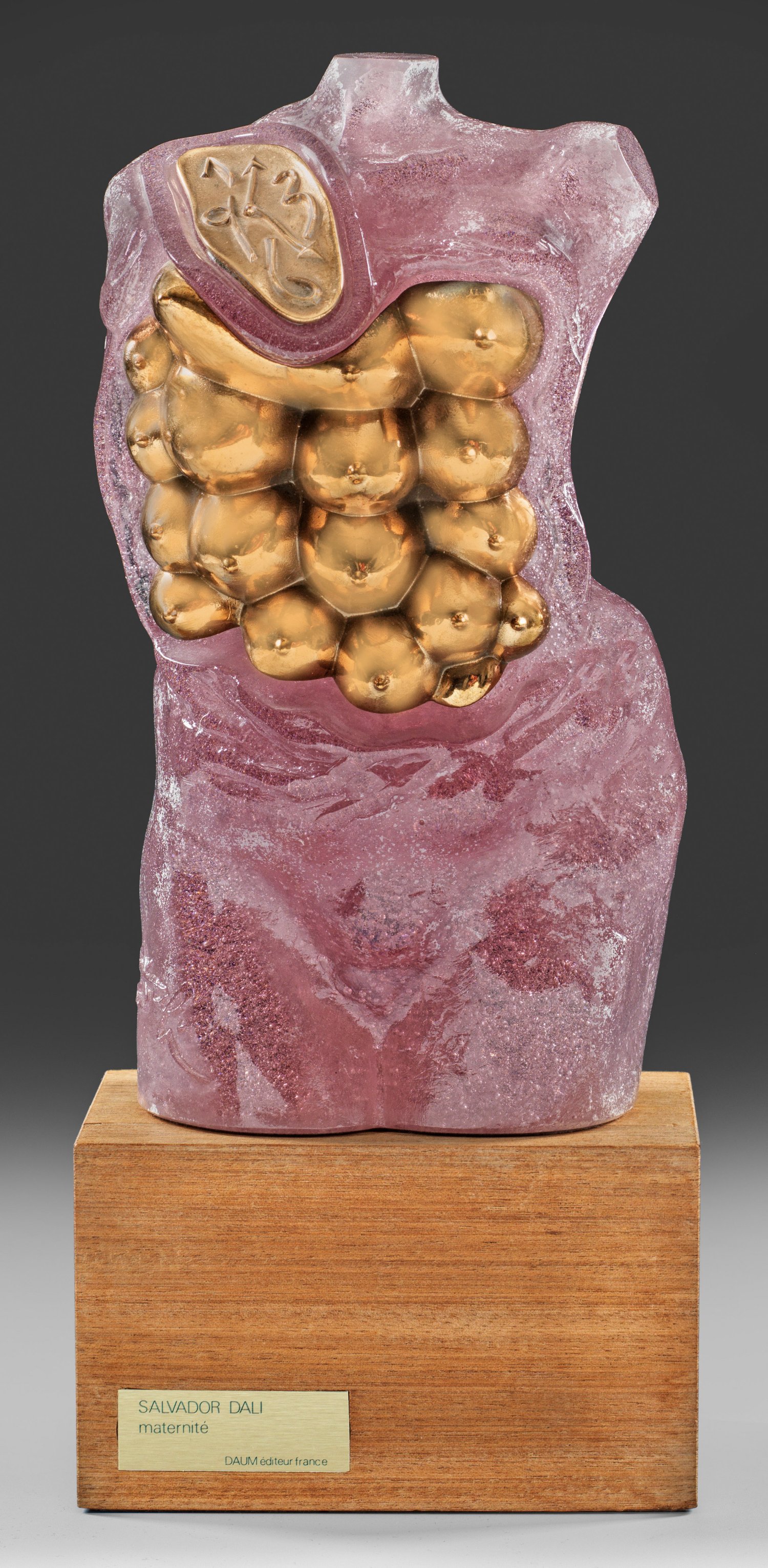 Die von der Cristallerie Daum in Nancy ausgeführte und herausgegebene Glas-Bronzeskulptur "Maternité" spiegelt die enge Zusammenarbeit des Künstlers mit der Manufaktur wider, die Mitte der 1960er Jahre begann und fast 20 Jahre andauerte. Dalí entdeckte, dass die transluziden Materialeigenschaften des Glases, insbesondere des weich-plastisch bzw. fließend wirkenden, formgeschmolzenen, farbigen Pâte de verre-Glases, das ideale Medium für seinen surrealistischen Ausdruck der Metamorphose bot. Insgesamt schuf er 21 Modelle zur Ausführung bei Daum, meist in Auflagen von nur 150-220 Exemplaren, womit er einer der kreativsten und bedeutendsten Künstler war, der jemals mit der Glasmanufaktur zusammenarbeitete.