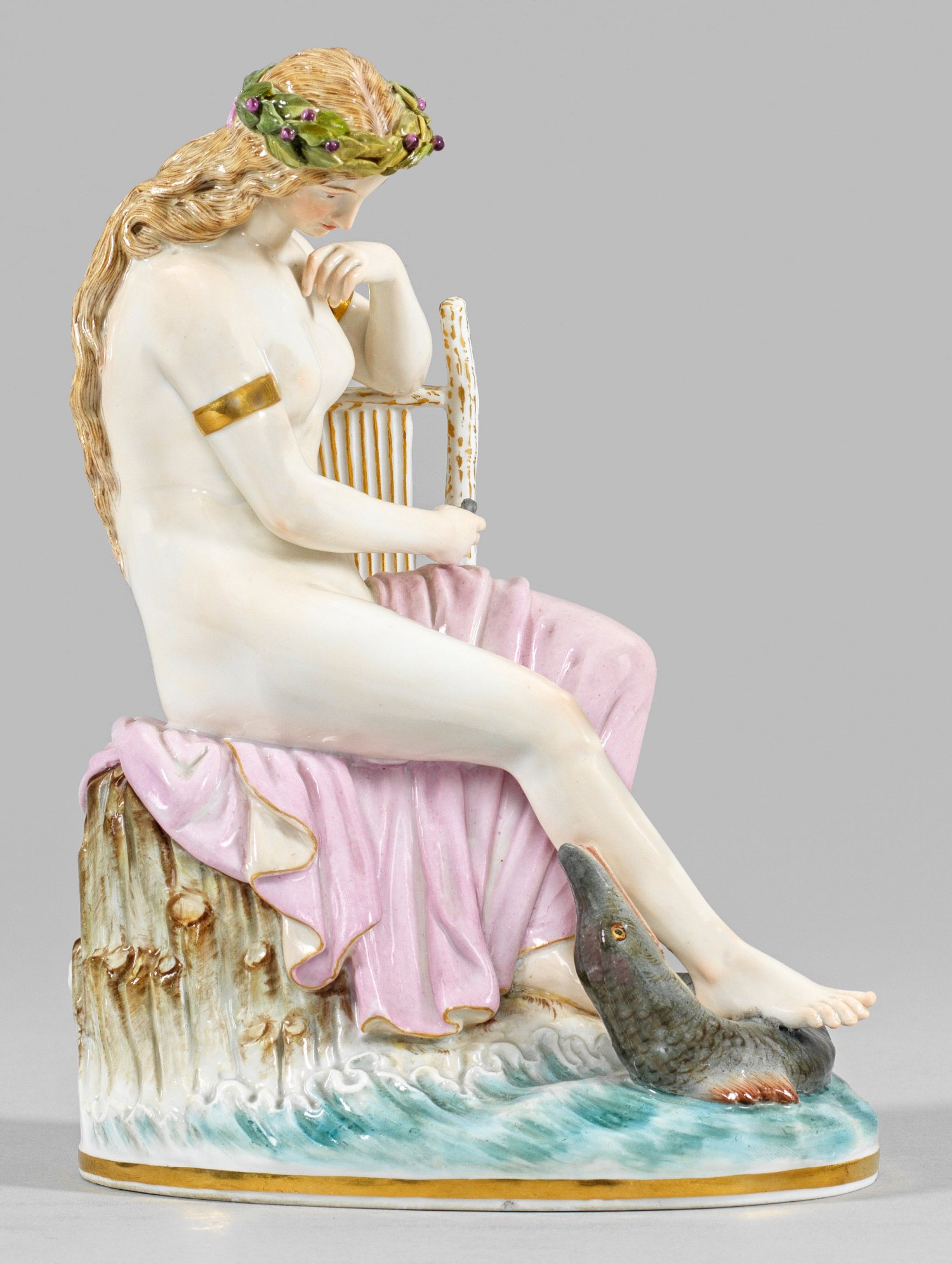 Ovaler, naturalistischer Sockel. Auf einem, von Wasser umspülten Felsen sitzende, halbbekleidete, sich auf eine Lyra stützende Sagengestalt Loreley, teilweise umhüllt von einem rosafarbenen Tuch. Das lange, gewellte Haar ist von einem Lorbeerkranz bekrönt, mit dem nach unten geneigten Kopf zu einem großen, sich windenden Fisch blickend. Polychrome Malerei mit Goldakzentuierungen. Entw. Ludwig Schwanthaler, um 1882 - 1885. Modell-Nr. N 109. Minim. rest.; Schwertermarke. H. 19 cm.