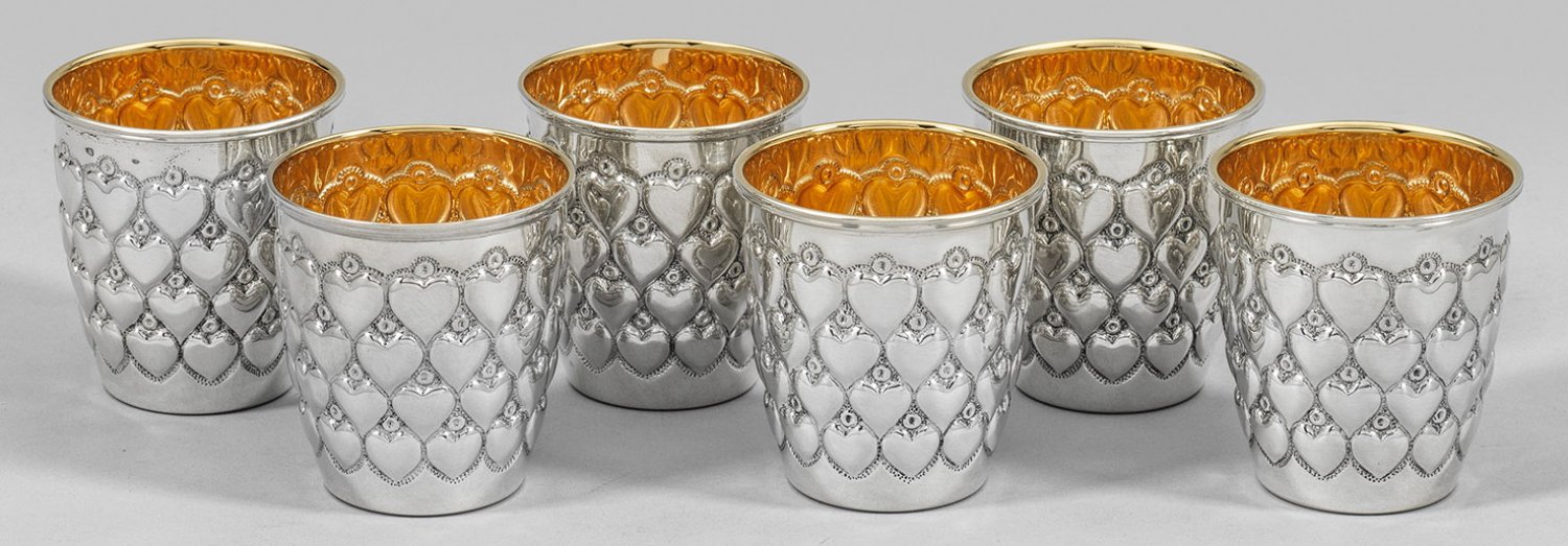 Silber. Konischer Korpus, flächendeckend umzogen von mehrreihig versetzt angeordneten, reliefplastischen Herzen. Innen vergoldet. Gest. 925. Gew. zus. ca. 640 g. H. 8 cm.
