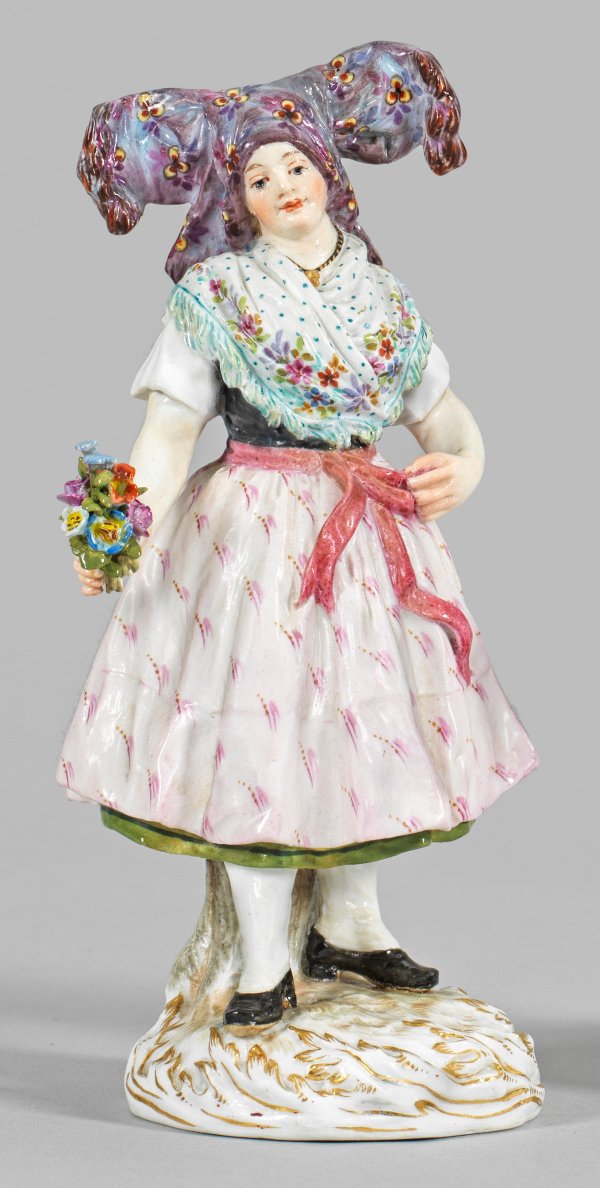 Auf blattreliefiertem Rundsockel stehendes Mädchen in traditioneller Tracht der Wenden mit imposantem Kopfschmuck. In der rechten Hand einen Blumenstrauß haltend. Polychrome Malerei mit Goldstaffage. Entw. Hugo Spieler, um 1897/98. Modell-Nr. Q 190 d. Rest.; Schwertermarke. H. 15 cm.